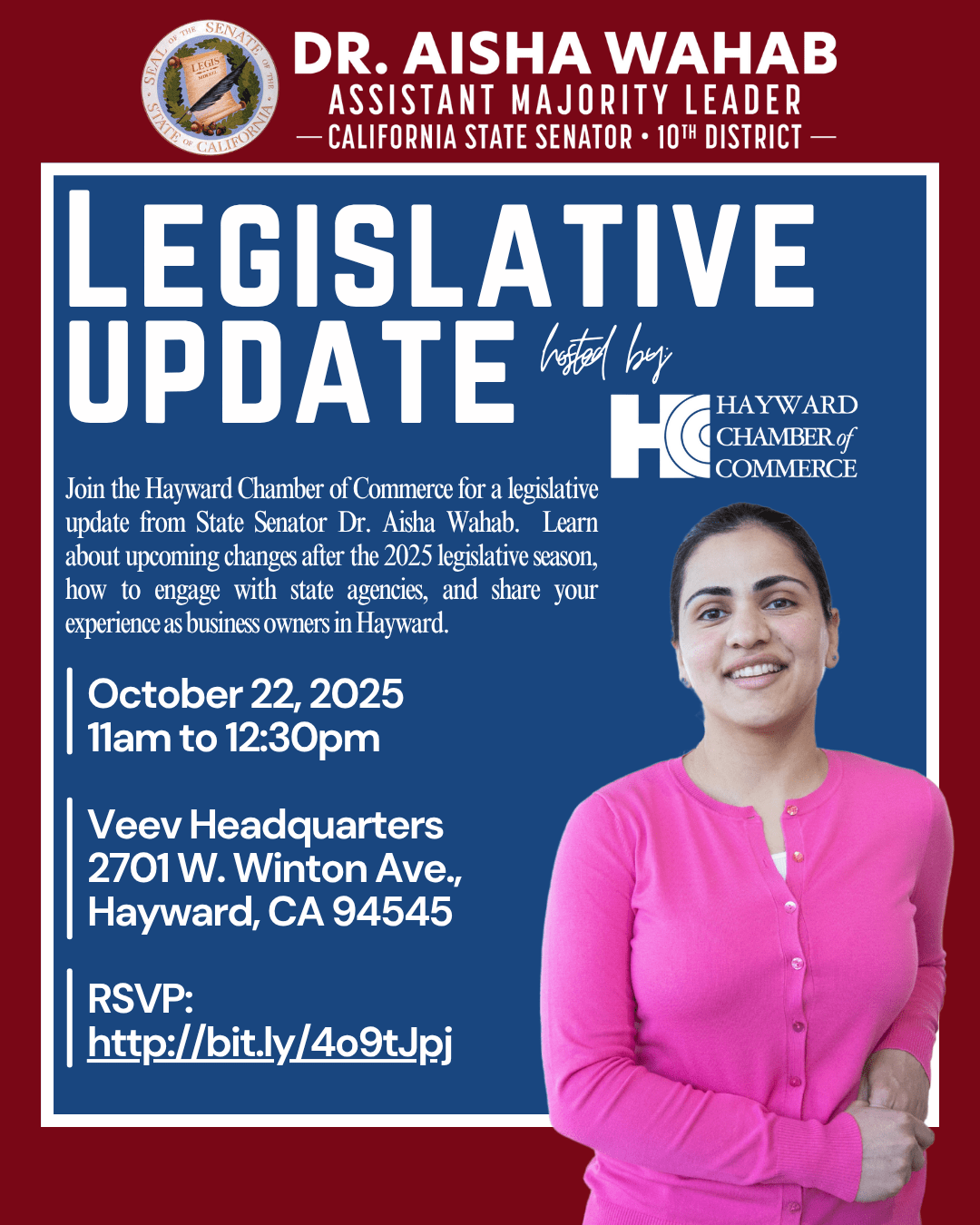 Discover what is ahead following the 2025 legislative session. Senator Dr. Aisha Wahab will discuss key policy changes affecting local businesses, share strategies for engaging effectively with state agencies, and we invite you to contribute your perspectives as Hayward business leaders.